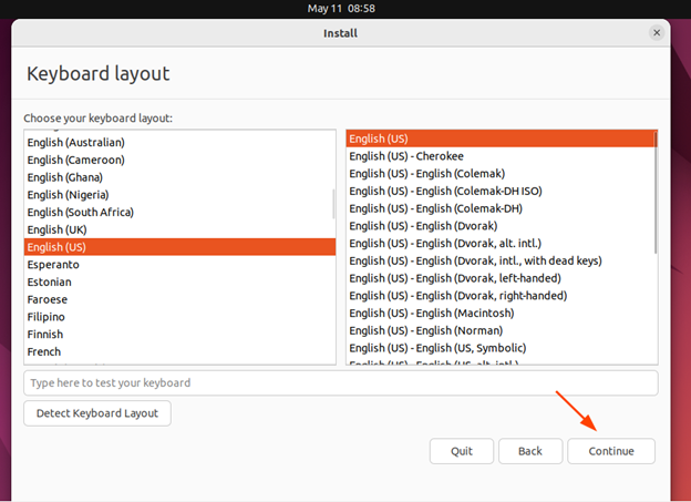 接下来,选择你的首选键盘布局,并单击 继续 Continue 按钮。