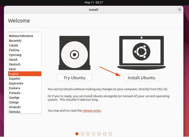 此后,安装程序向导将弹出,向你提供两个选项: 尝试 Ubuntu Try Ubuntu 和 安装 Ubuntu Install Ubuntu 。因为我们的使命是安装 Ubuntu ,所以选择后者。