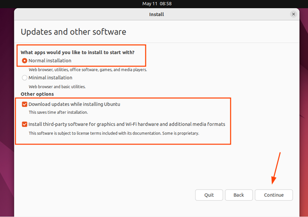 在 更新和其它软件 Updates and Other Software 步骤中,选择 正常安装 Normal Installation 以便安装 Ubuntu的 GUI 版本,通过勾选其它剩余选项来允许下载更新和安装第三方的针对于图像、WIFI 硬件和其它实用程序的软件包。