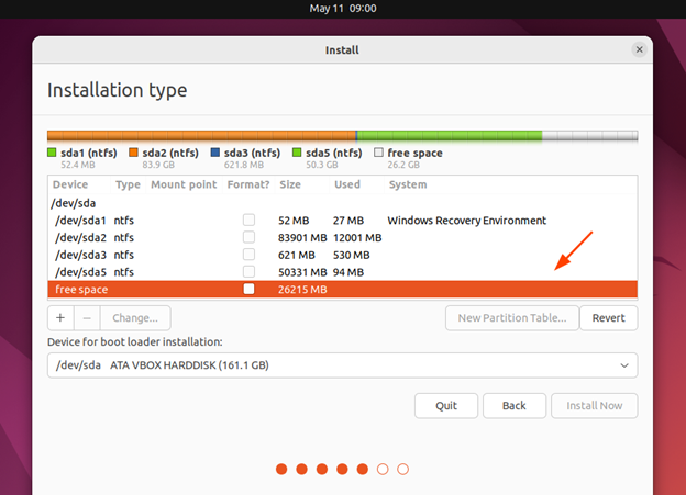 分区表将显示所有现有的磁盘分区。到目前为止,我们仅有 NTFS 分区和我们之前压缩出来的可用分区。