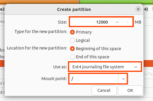 接下来,定义 /(根)分区,并单击 确定 OK 按钮。
