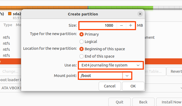 如图显示填写 /boot 分区的详细信息,然后单击 确定 OK 按钮。