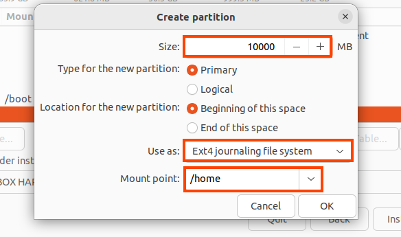 接下来,具体指定 /home 分区,并单击 确定 OK 按钮。