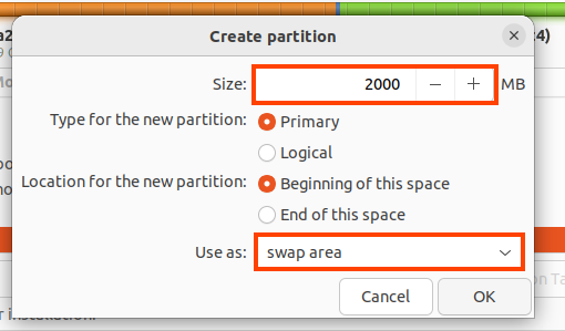 为定义交换空间,设置大小,并在 使用为 Use as :选项中选择 交换区域 Swap area 。