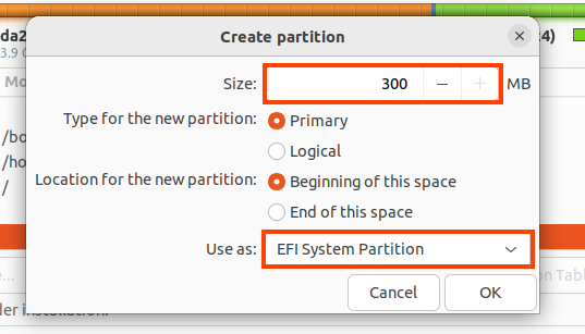 最后,如果你正在使用 UEFI 启动模式,那么创建一个 EFI 系统分区。我们将分配 300MB 到 EFI 分区。