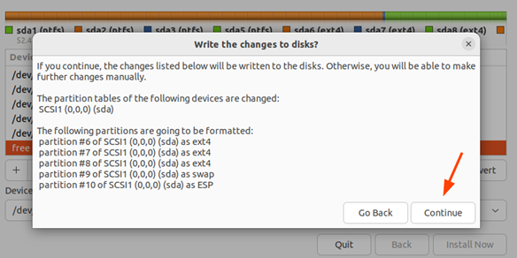 为继续安装,单击 现在安装 Install Now 。在下图显示的弹出窗口中,单击 继续 Continue 来保存更改到磁盘。