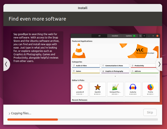 此时,安装程序向导将复制所有的 Ubuntu 文件和软件包到手动创建的硬盘驱动器分区,并安装必要的软件包。