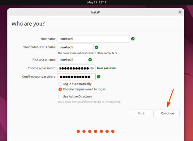 接下来,通过具体指定姓名、计算机的名称和密码来创建一个登录用户。接下来单击 继续 Continue 按钮。