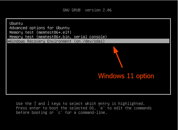 选择 “Ubuntu” 来启动到你的新 Ubuntu 22.04 安装。要启动到 Windows 11,请选择标有 Windows 恢复环境 Windows Recovery Environment 的条目。