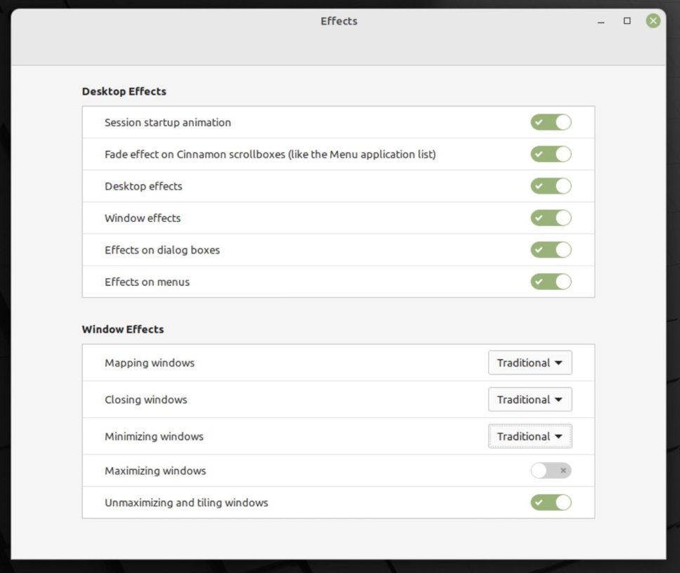 窗口和桌面动画效果有一些相当大的变化。首先,合并了窗口和桌面的效果设置。先前,是在不同的部分对动画进行细微的控制。