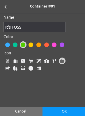 接着输入新容器的名称,选择颜色和图标。然后,点击 “OK” 保存新容器。