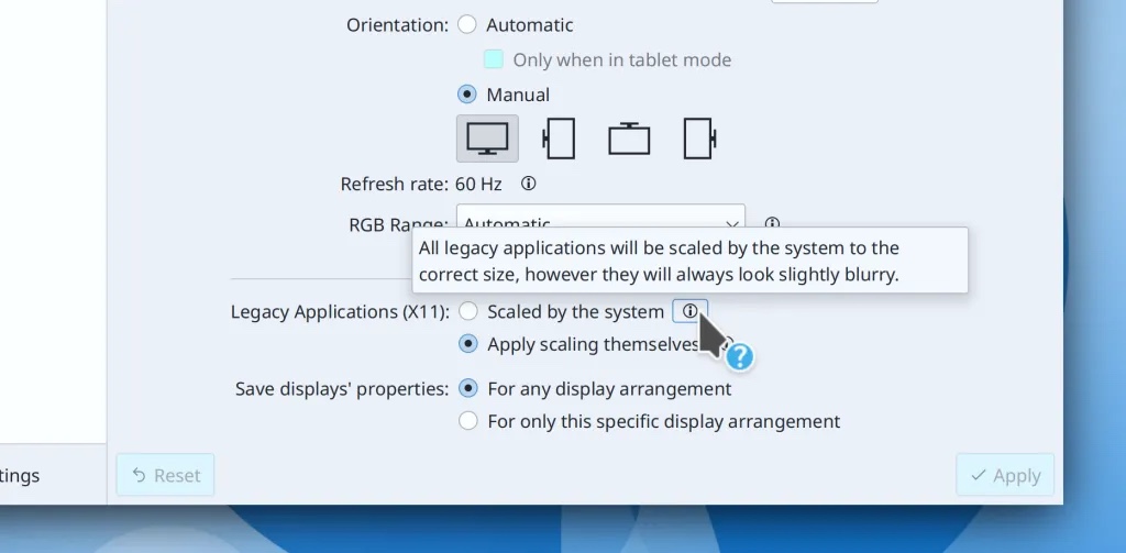 另一种是允许应用程序自己缩放。请注意,支持预置的 X11 HiDPI 的应用程序只能通过这种设置进行改善。