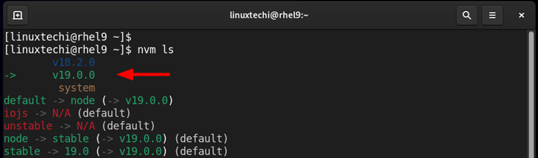 再次检查已安装的 Node.js 版本,这次“->” 符号将指向 v19.0.0。
