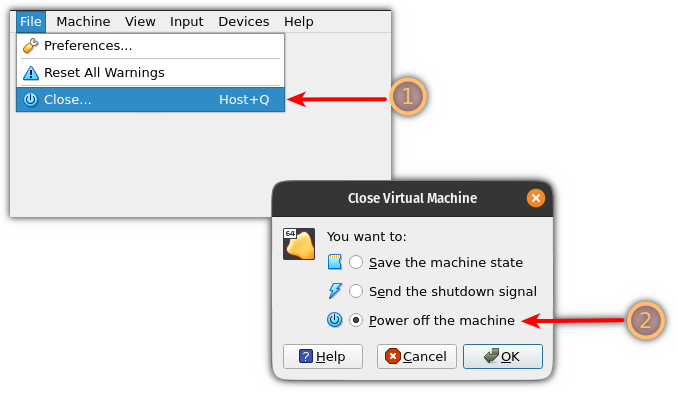 要关闭虚拟机,请从“ 文件 File ”菜单中选择 “ 关闭 Close ” 选项,然后选择 “ 关闭虚拟机电源 Power off the machine ” 选项: