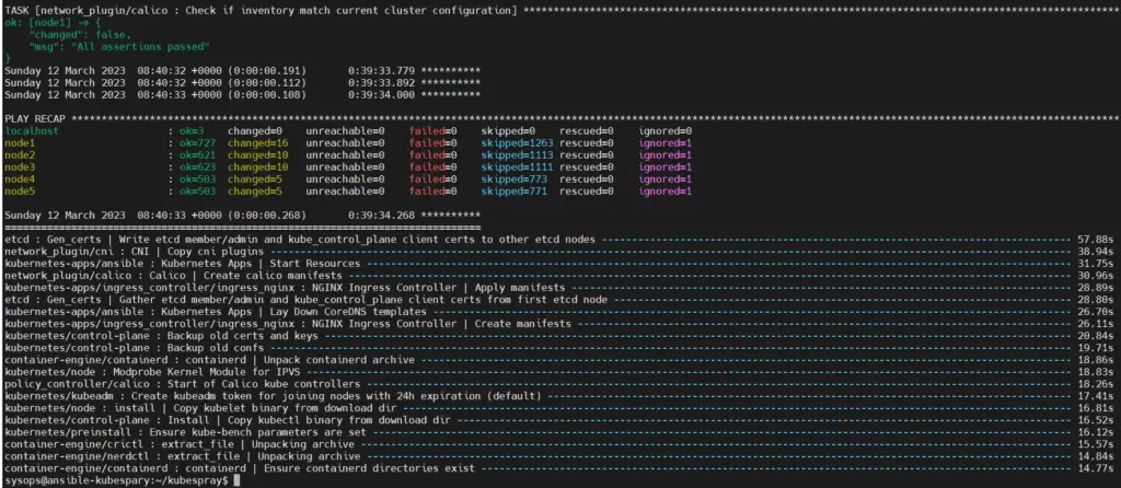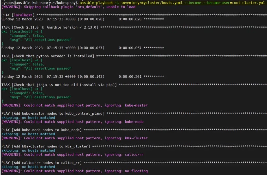 $ ansible-playbook -i inventory/mycluster/hosts.yaml --become --become-user=root cluster.yml