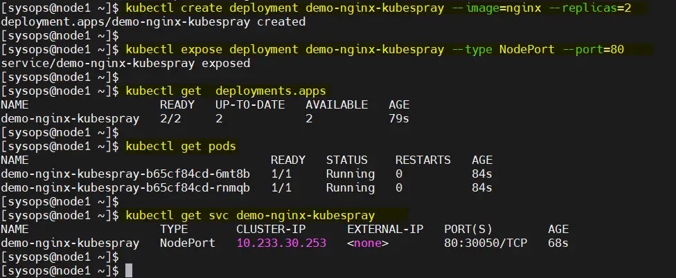 $ kubectl create deployment demo-nginx-kubespray --image=nginx --replicas=2