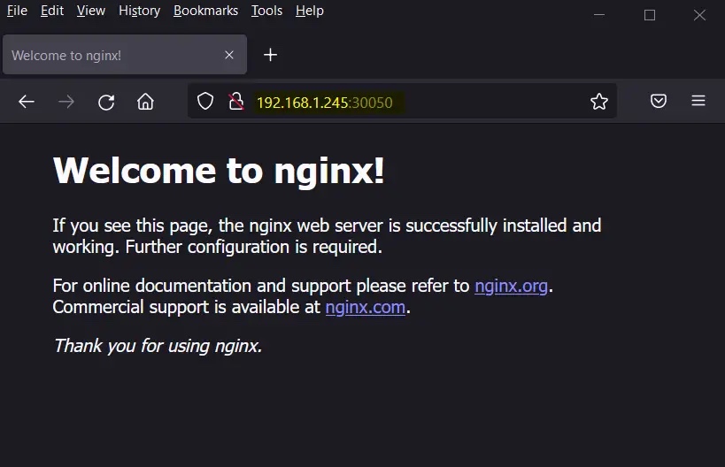 现在尝试使用工作节点的 IP 地址和节点端口(30050)访问此 Nginx 应用。