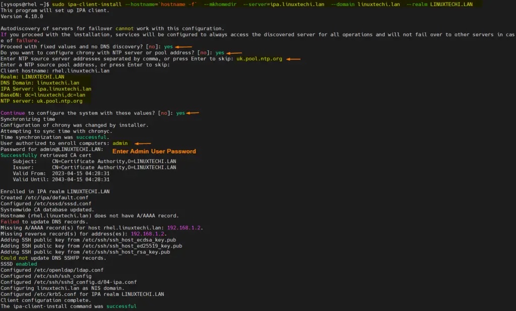 $ sudo ipa-client-install --hostname=`hostname -f` --mkhomedir --server=ipa.linuxtechi.lan --domain linuxtechi.lan --realm LINUXTECHI.LAN