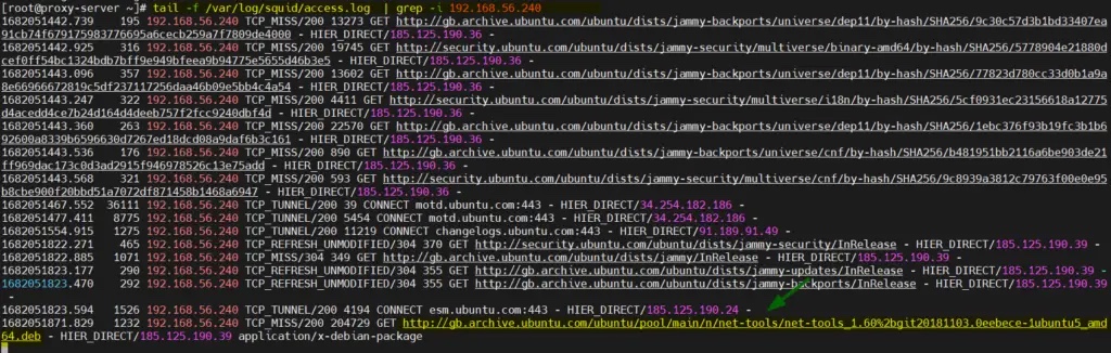 # tail -f /var/log/squid/access.log | grep -i 192.168.56.240