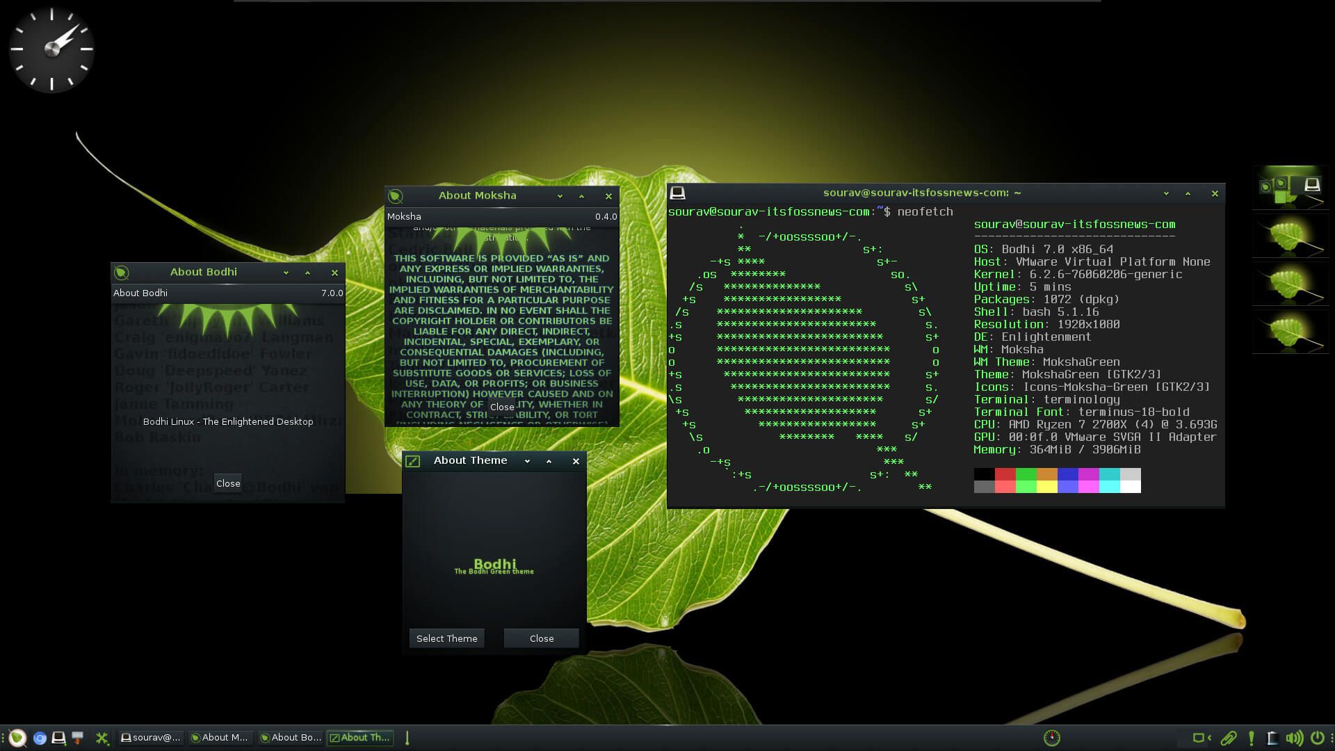 Bodhi Linux 7.0 版现在引入了一款全新的默认主题,叫做 MokshaGreen。它包含了一款 动态背景、全新的 Plymouth 引导屏幕,以及 全新的登录屏幕主题。
