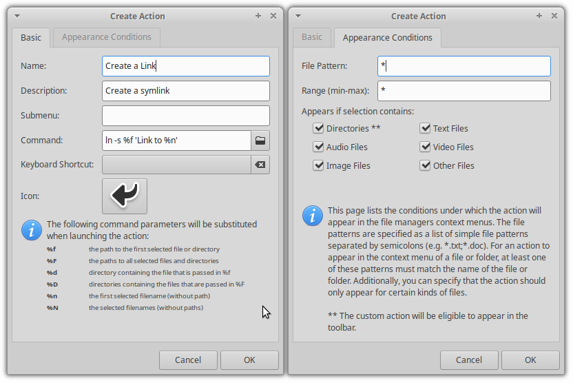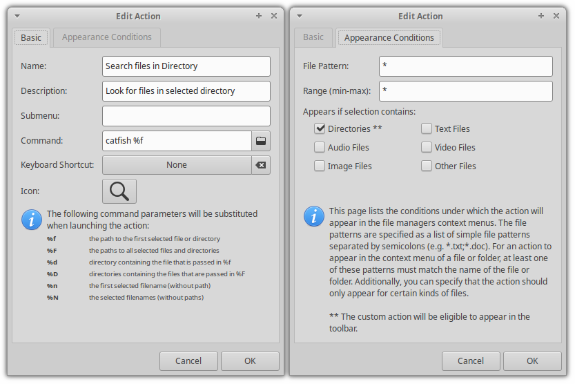 如果你仔细看,你会发现还有另一个名为 “ 出现条件 Appearance Conditions ” 的选项卡,在这里你可以指定在哪些文件(以及目录)类型的右键菜单中这个动作会出现。