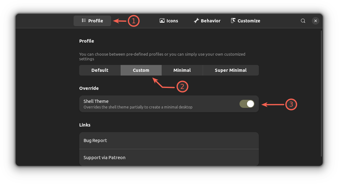 要实现透明的停靠区,你需要在 “ 用户配置 Profile ” 菜单中选取 Custom 配置文件,并启用 “ Shell 主题 Shell Theme ” 选项即可: