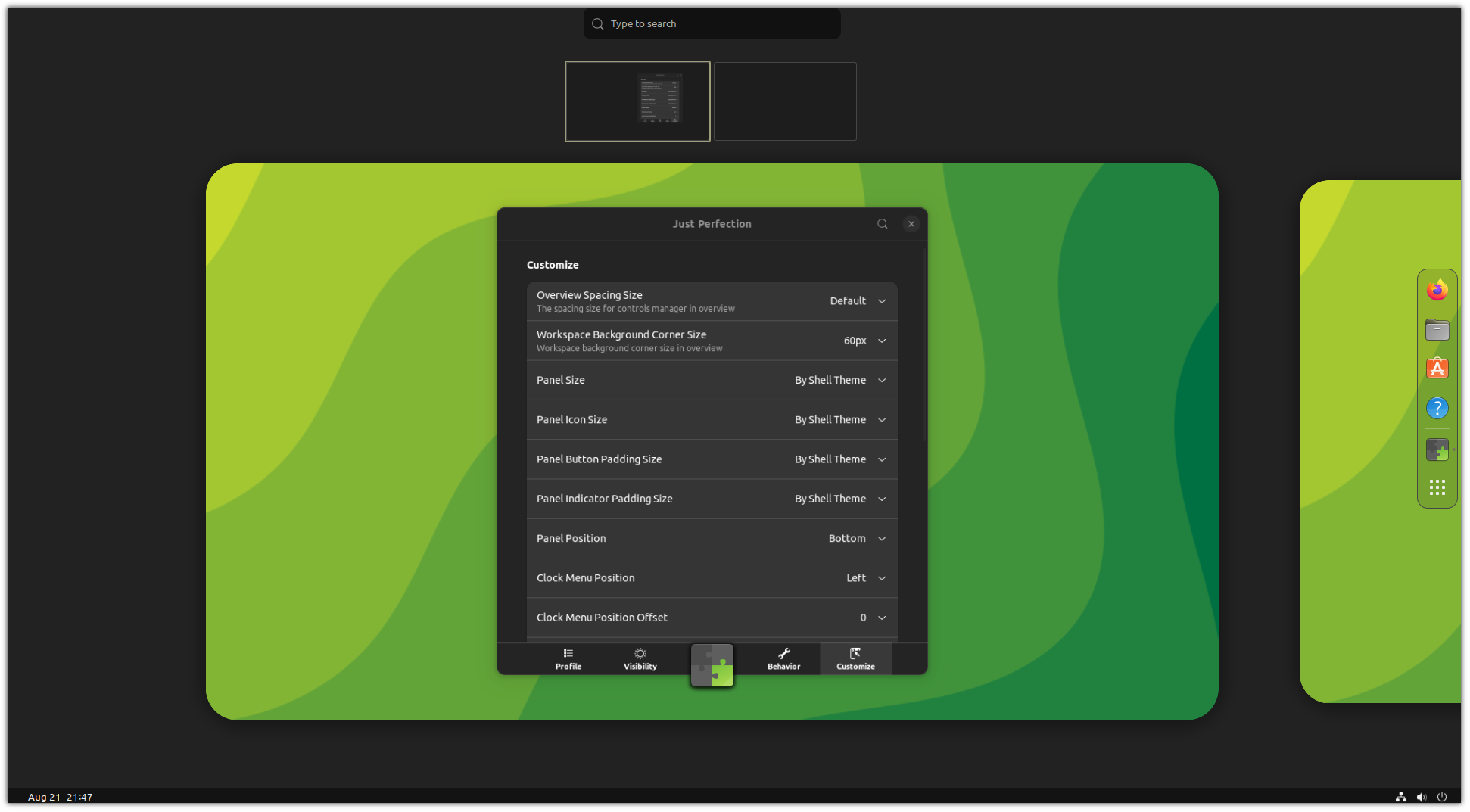 在此,我想向你推荐一款名叫 Just Perfection 的 GNOME 扩展,它帮助你一次性修改桌面的多种设置。