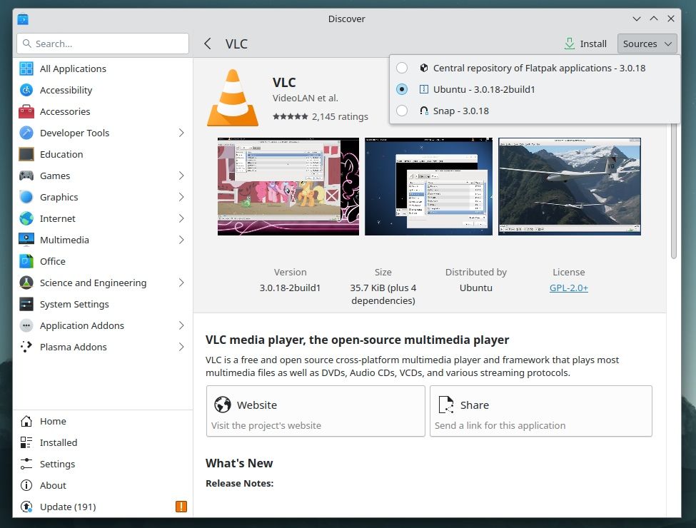 提及 Kubuntu,你得到的软件管理器是 “ 发现 Discover ” 应用。你也可以从软件仓库以及 Snap 包中安装应用。