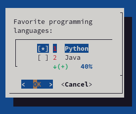 dialog --clear --checklist "Favorite programming languages:" 10 30 7\