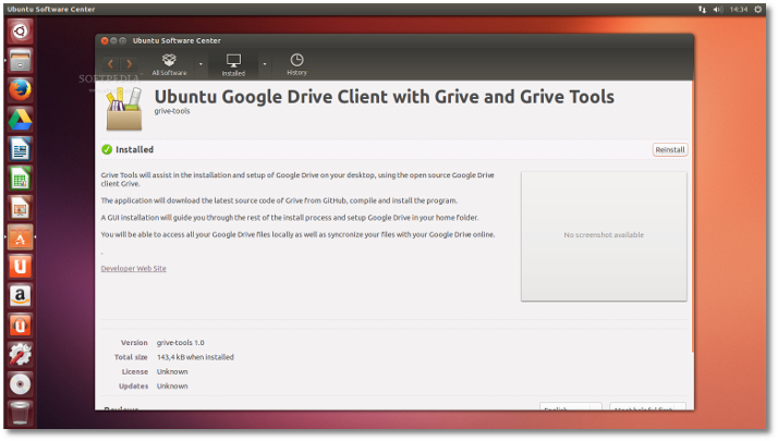 在这里下载正确的Grive Tools包并保存在你的桌面上,下载完成后双击它,此时Ubuntu软件中心将打开,这样你就可以轻松容易的安装该应用了。