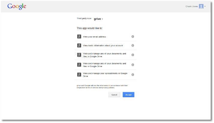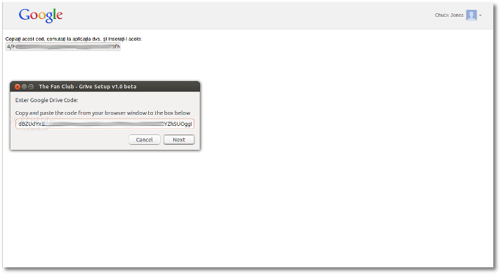 一个web浏览器或标签将被打开,要求您登录到您的Google账号(如果你尚未登入)并授权给该应用去访问你的Google云端硬盘,单击蓝色的"Accept"按钮后你将可以看到Google认证码,你需要将该认证码复制并且粘贴在Grive设置对话框上。