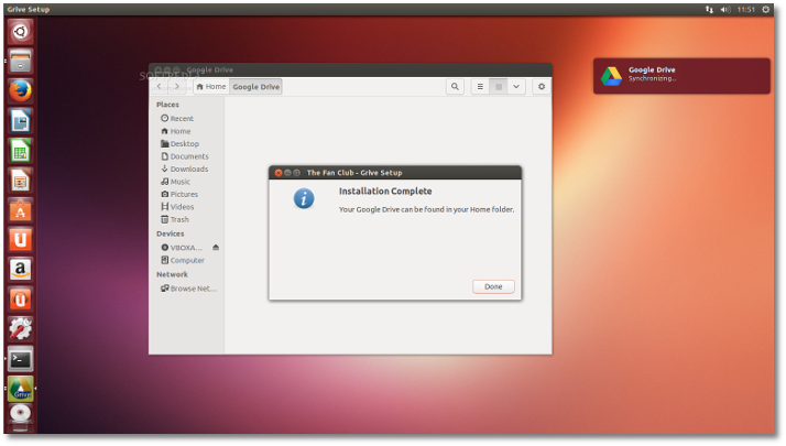 就是这样!你的Google云端硬盘上的文件将根据你的Google账号立即下载到并放置到你的家目录下的"Google Drive"文件夹下。同步时你将可以看到一个桌面通知。