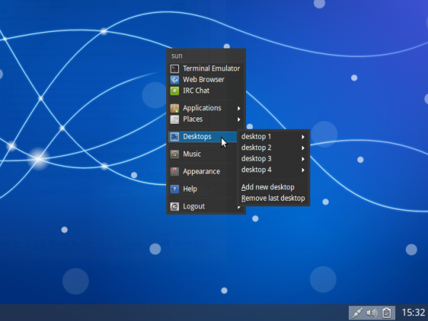 默认情况下,在桌面或底部面板上点击鼠标右键可以呼出菜单栏。如下图所示,有4个桌面或者说工作台供用户选择。