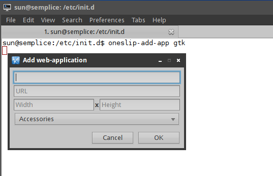 系统还在菜单中提供了一些Web应用程序(例如Facebook和Twitter),你也可以通过该发行版提供的工具添加其他Web应用。只需要按照下图所示,在命令行中输入命令(oneslip-add-app gtk)就可以了。