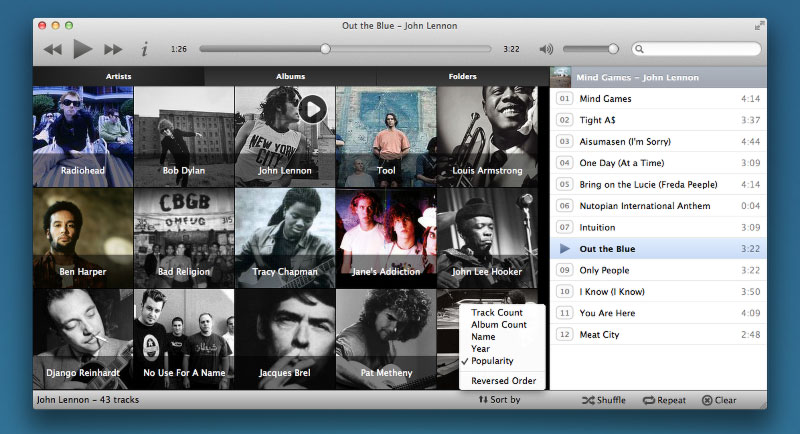 Musique 1.3建立在先前版本的核心功能之上,添加了最被期望的功能:通过网格视图中的歌手名字、人气指数、年代等来 排序艺术家及专辑