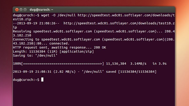 这个测试是使用wget命令从远程仓库服务器下载一个10MB文件(译者注:其实你可以下载任何一个其它的较大文件)。当文件下载完成,下载速度就会显示在终端,你就可以知道你正在连接的网络速度有多快了(译者注:其实这也与你所下载的文件所在的带宽有关,并非全面的测试)。