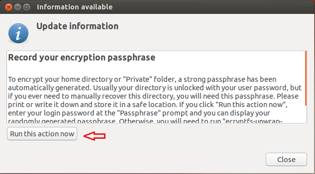 使用被加密的账号第一次登录后,你将会看到如下截图的界面,包含更多关于加密home文件夹的信息。