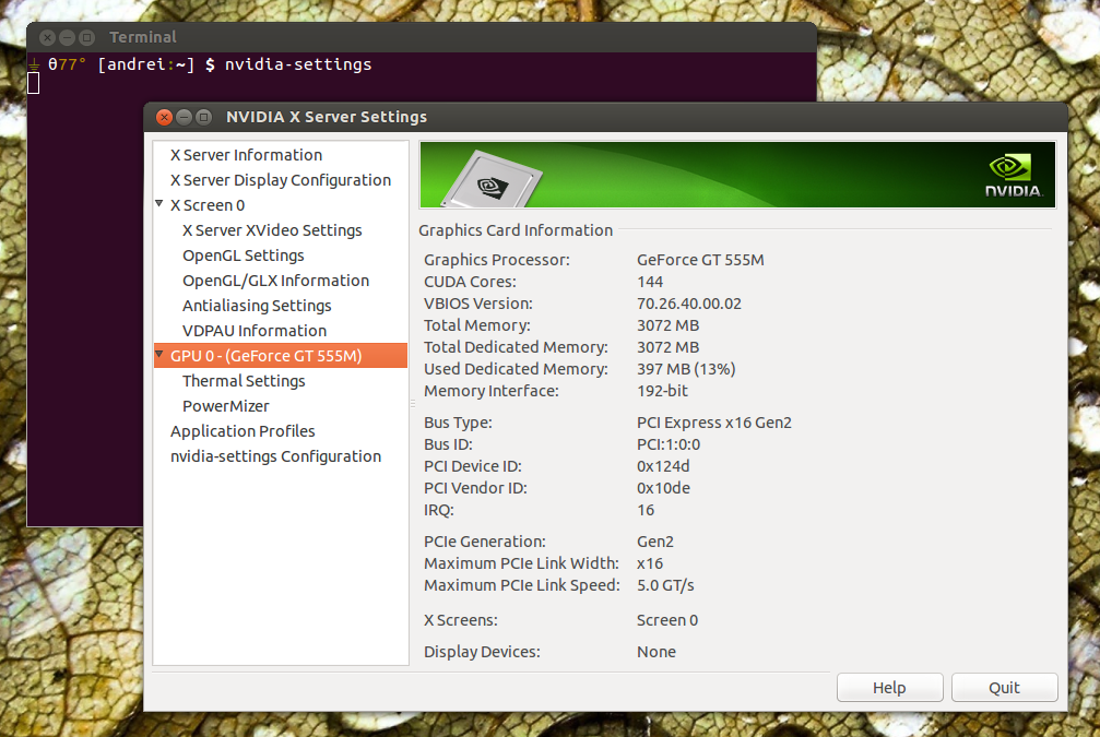 但是Ubuntu 13.10用了“nvidia-prime”包来过渡。这个包使默认支持Intel显卡芯片的Optimus平台也支持Nvidia显卡。通过下面指令你能Nvidia显卡一直处于工作状态,就是说没有办法让它停止工作来节能了。这样笔记本就会功耗更大和过热–——对我而言,我是不会 用这个的,除非过热的问题解决了,如果没有解决的话,你可以取消这个设置。