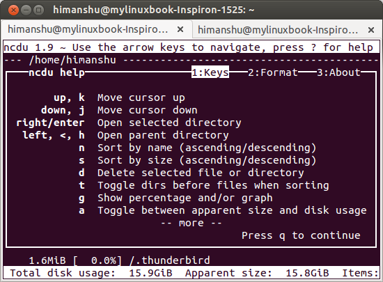 想知道有关命令行选项以及其它信息,可前往ncdu命令的Man页面。