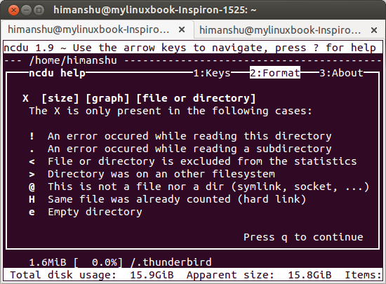 按**?**可获得相关快捷键、格式以及有关ncdu版本的信息。