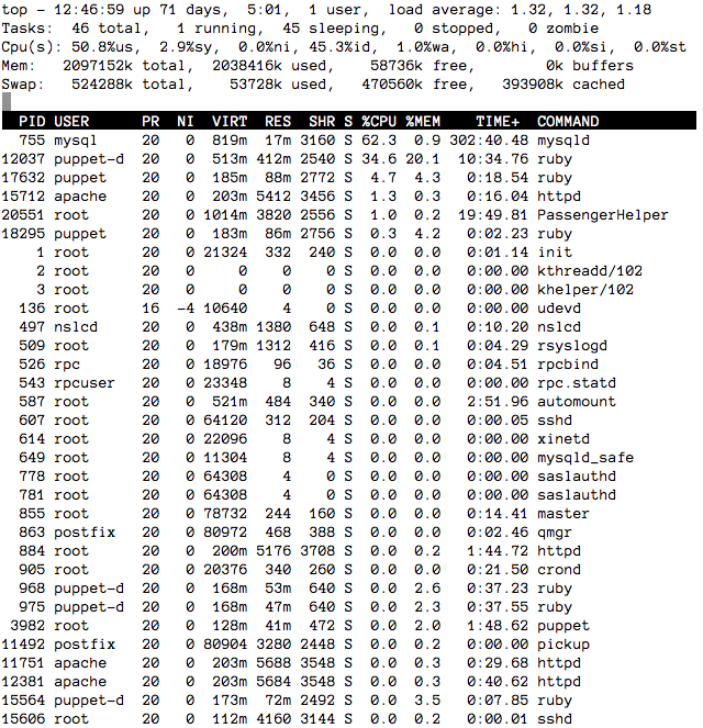 当对服务器的性能好奇时,我第一个想到的是"top"命令。top不是最好的,它不是一个长期的快照,但是它提供了服务器的一个不错的时间点快照,并且试着提供了告诉"现在在发生什么?"。不幸地,如果你没有深入了解不同显示域的意义,top的输出很容易被误解。