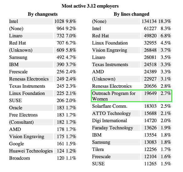 据LWN 10月分析报告,在内核3.12上,OPW再次排在了贡献最大的团队或公司之中,这次是排行第11行,有19,649行代码的改动。那代表了在过去最新的一次开发周期中接近2.7%的改动量。