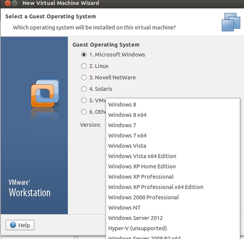 你可以从所有的类型中选择创建各种客户机,包括Windows,Linux,Nevell,Solaris等。