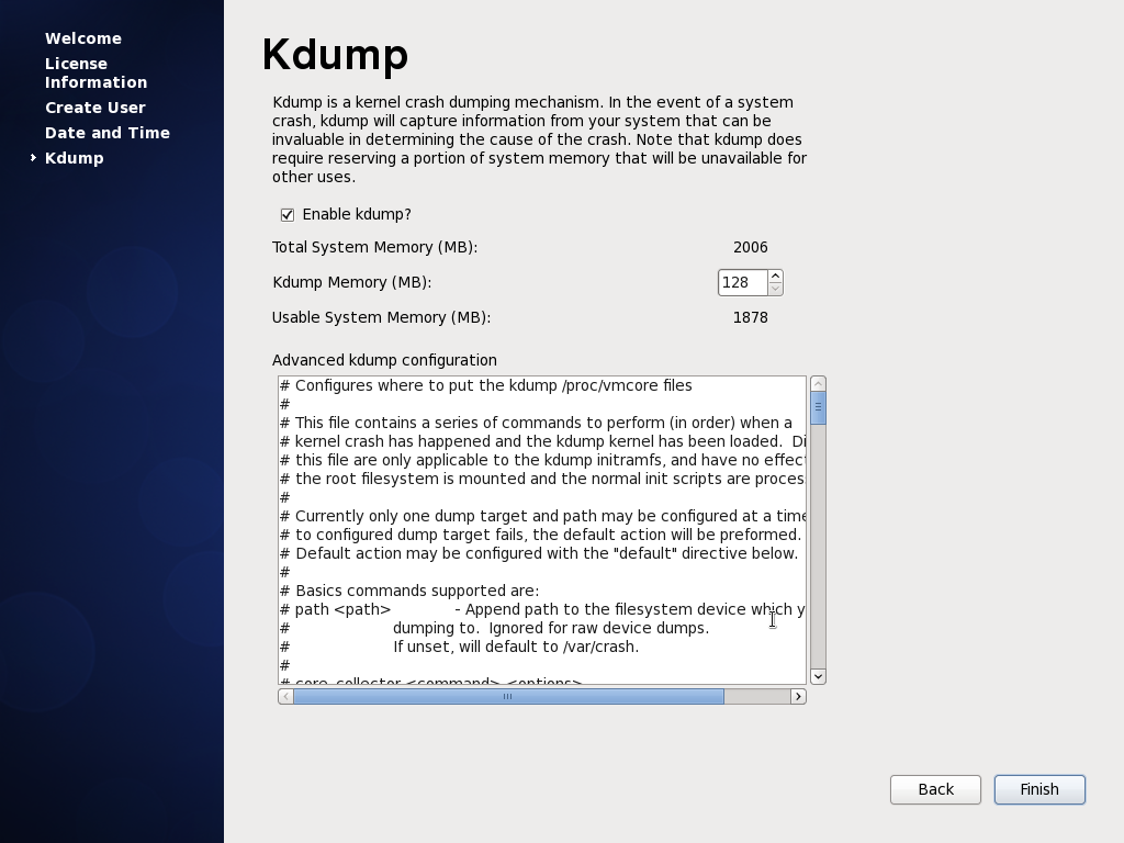 15.Kdump这是欢迎向导的最后一步,询问Kdump应该是开启还是关闭。推荐开启它。