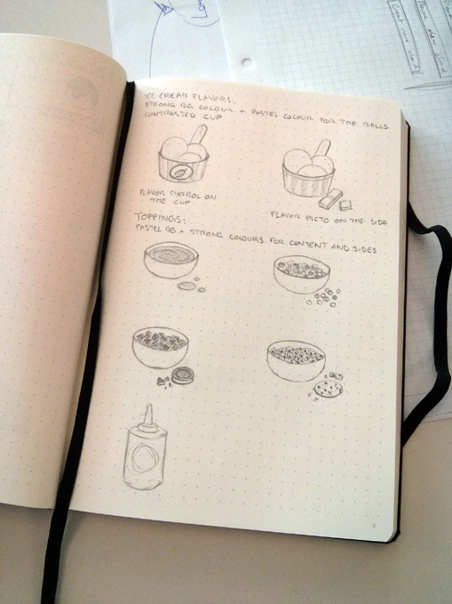 最初我以缩略图和设计思想的方式使用一种扁平外观的图标。这种方式对冰激凌来说很有用,但是对点缀物作用不大 —— 不久之后我发现它们变成半分离的现代主义,很难辨认。