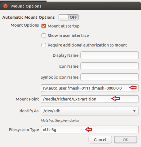 /dev/sdb /media/richard/ExtPartition ntfs-3g rw,auto,user,fmask=0111,dmask=0000 0 0
