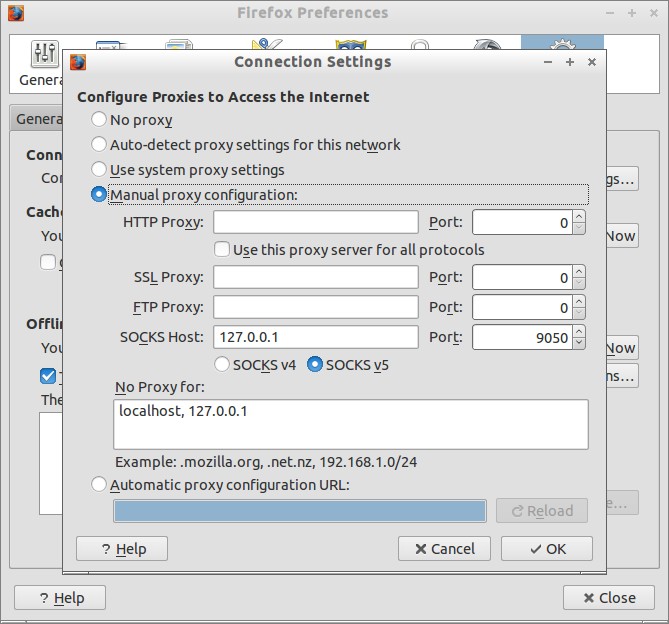 打开浏览器。进入 编辑 -> 首选项 -> 高级 -> 网络 ->设置。如下截图所示,选择手动配置代理,在 SOCKS Host 一栏,输入 localhost 或者 127.0.0.1,在端口一栏输入 9050