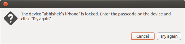 然后我心中默念“我会的”,选择了“信任”,在等待了几秒后,它又重新提示我“是否信任这台电脑”?我继续点了“信任”。然后又提示同样的问题。我感觉我的手机陷入了一个while(true)的死循环。在Ubuntu而在我的Ubuntu电脑上,它只是提示我的iPhone被锁定了,所以我不能访问上面的文件。