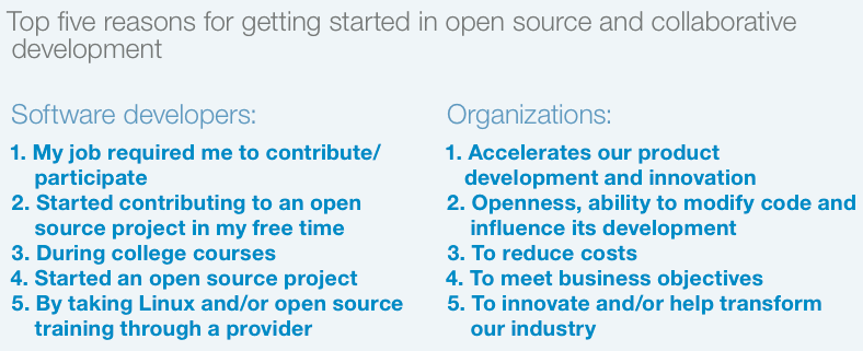 从 Linux 基金会的调查可以发现另一些有趣的事实,每一点都表明将来开源会对企业有更大的影响力,企业也会更多参与开源。