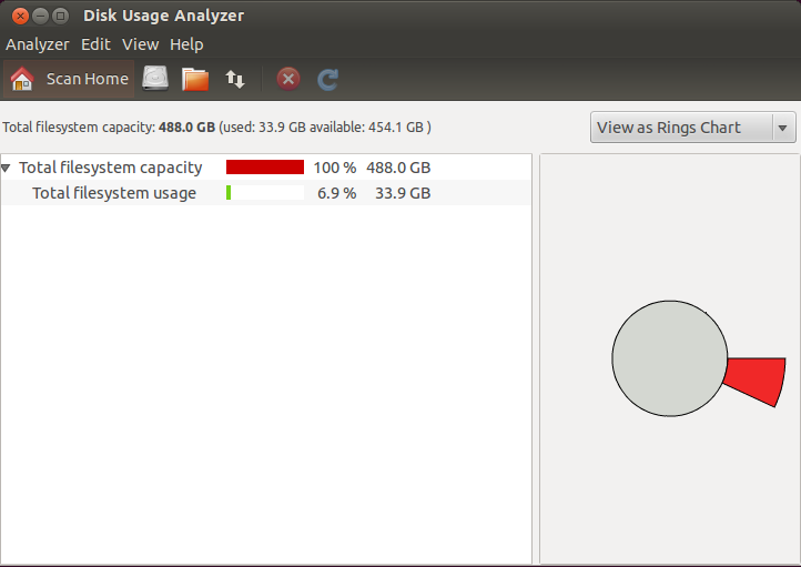 正如上图所见,baobab 扫描结果提供给我们很多信息,包括 Home 目录中每一个文件夹的使用情况、大小,以及所拥有文件数。右边有一个饼状示意图。如果你喜欢,选择上方的 View as Treemap Chart,你可以轻松地把它换成树状图。